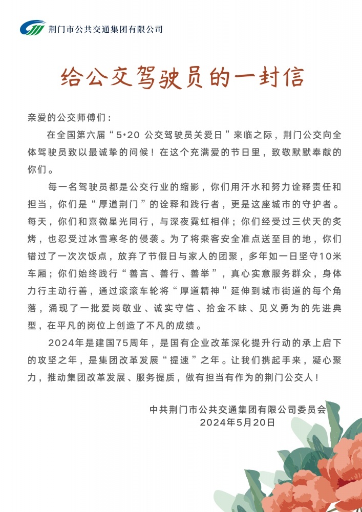 為倡導(dǎo)社會(huì)關(guān)愛公交駕駛員,營造理解、尊重公交駕駛員的良好氛圍,5月20日,市公交集團(tuán)以“全國公交駕駛員關(guān)愛日”為契機(jī),通過一系列關(guān)愛駕駛員的活動(dòng),為公交駕駛員們送上節(jié)日祝福和關(guān)愛。