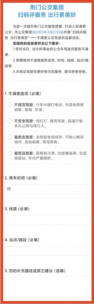 市民乘客可通過掃描公交車上的“服務監(jiān)督二維碼”,進入“不滿意公交駕駛員監(jiān)督舉報”頁面,填寫詳細舉報信息(評價頁面如下)。