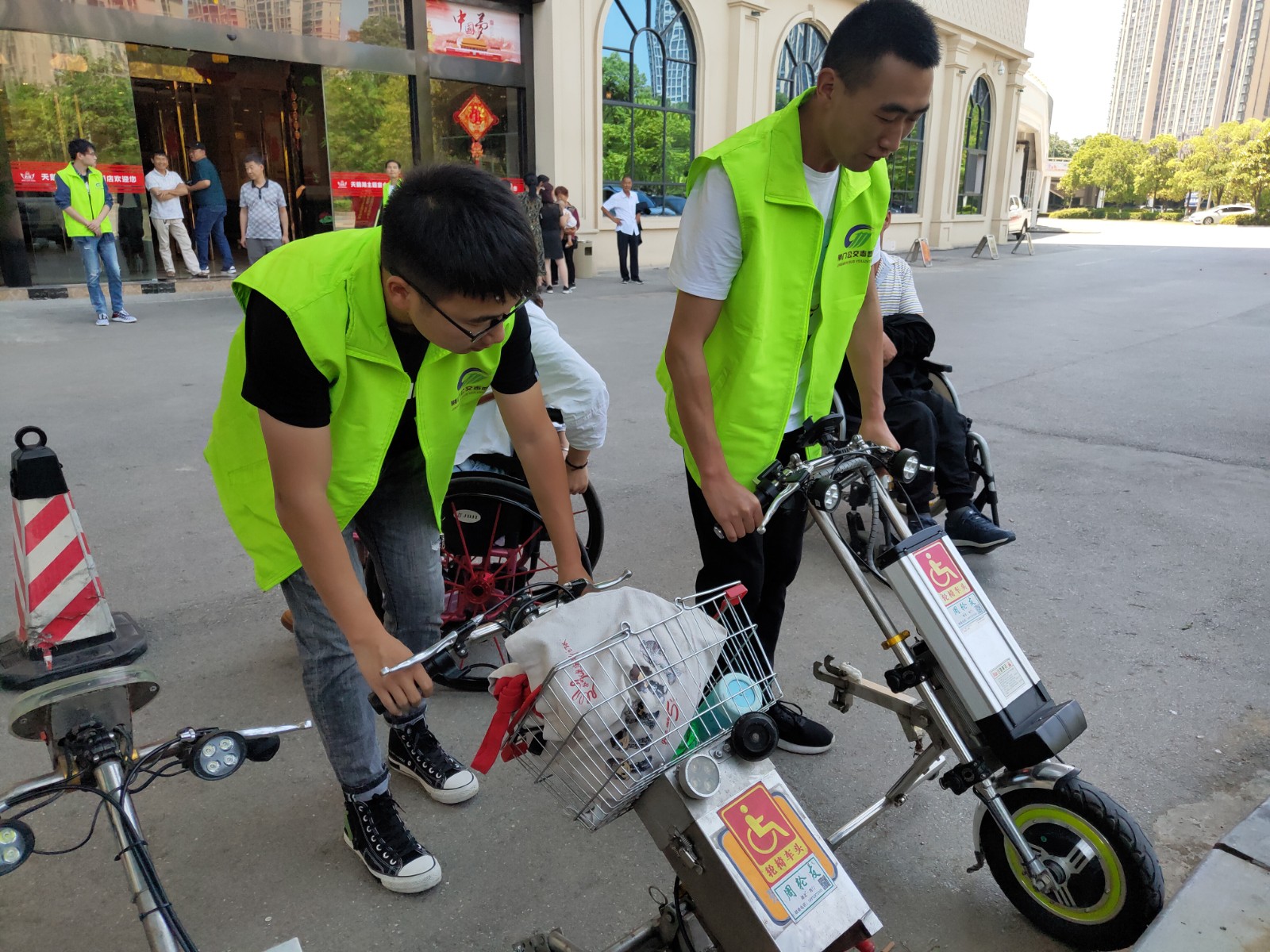 (▲圖為 公交志愿者幫輪椅殘疾人將輪椅機(jī)頭整齊擺放)