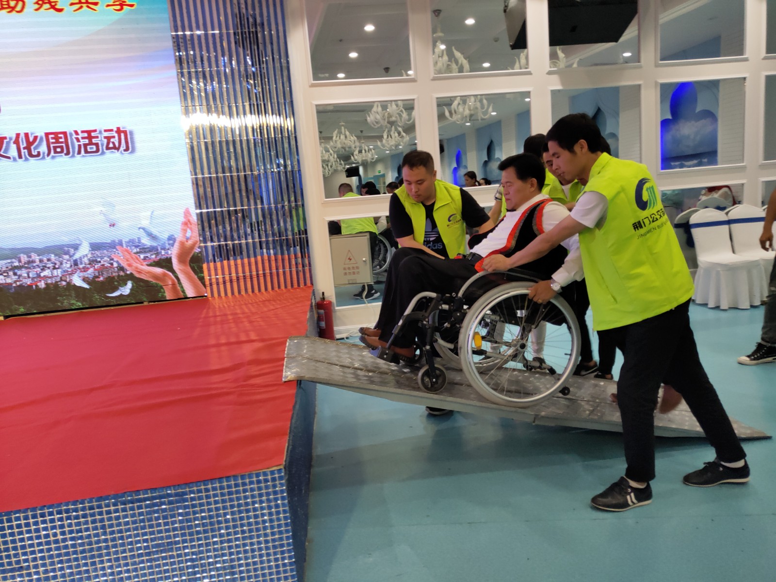 (▲圖為 天鵝湖酒店門前 公交志愿者等候殘疾家庭到來)