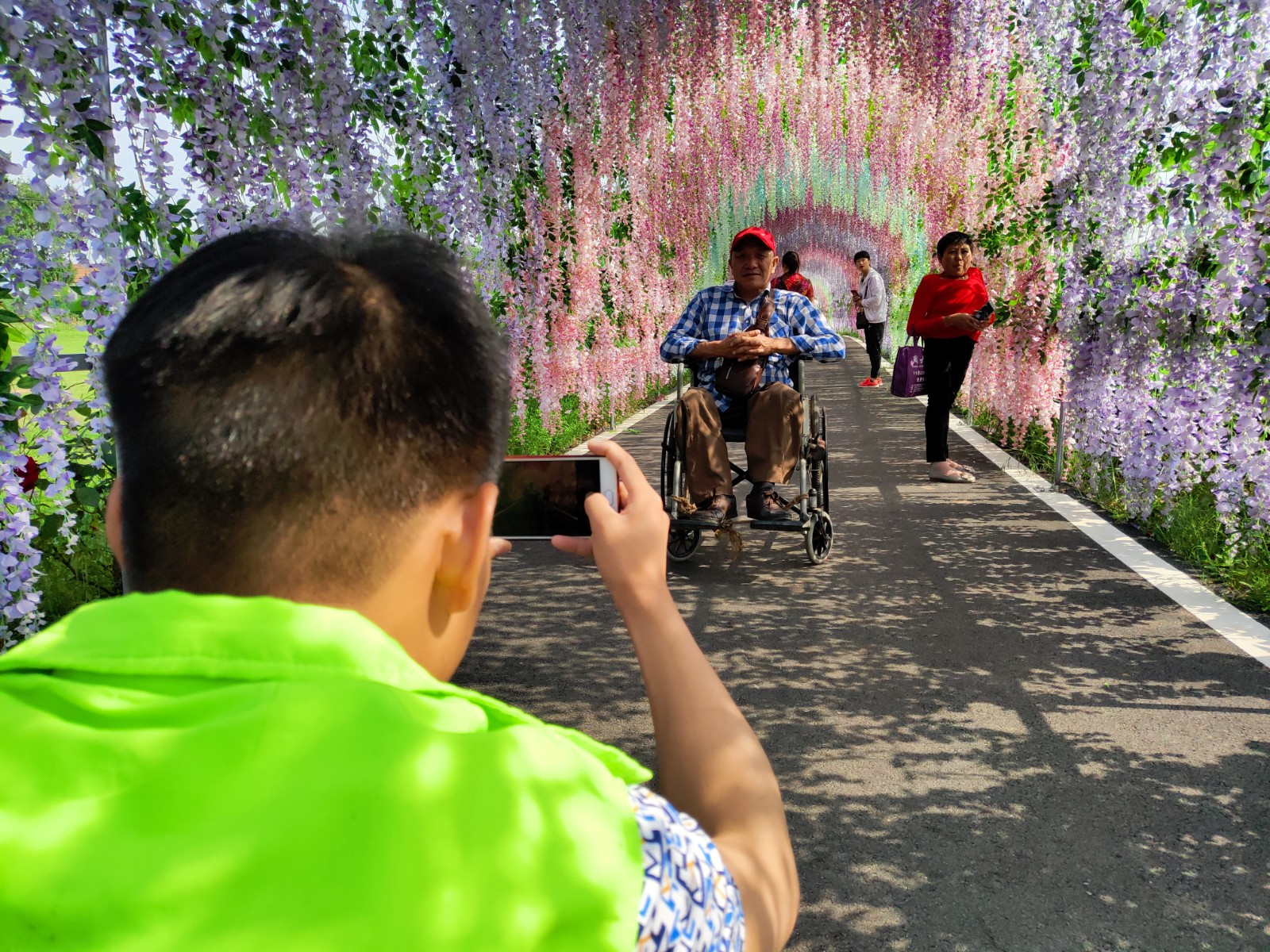(▲圖為 志愿者陪同殘疾朋友游玩圣境花谷)