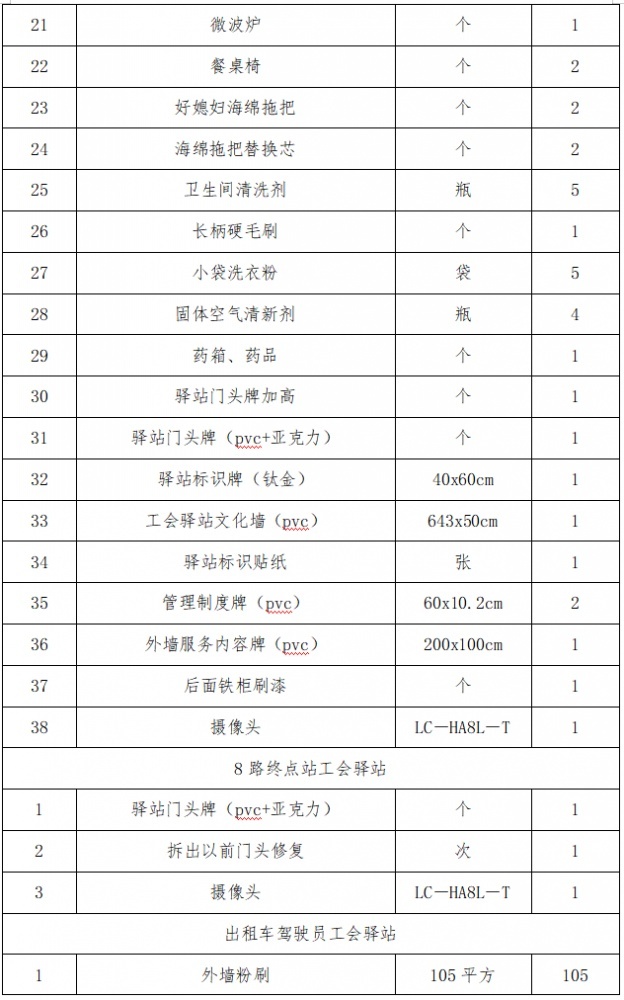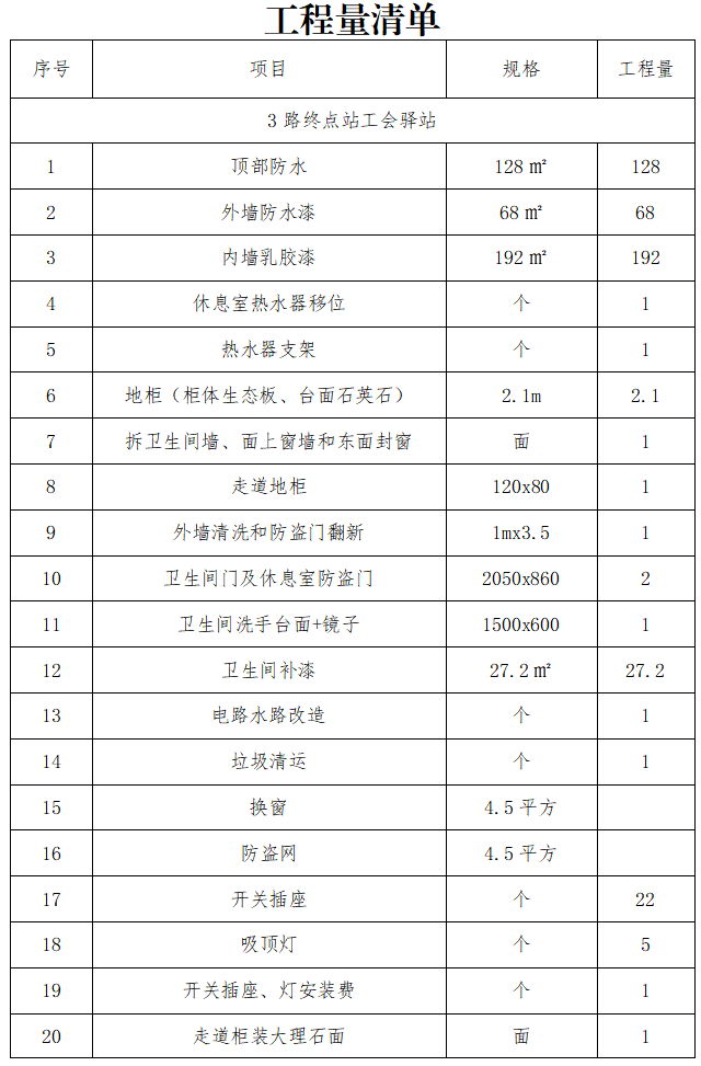 工程內(nèi)容:3路、8路終點(diǎn)站及出租車駕駛員休息驛站,統(tǒng)一規(guī)劃、整合升級(jí),具體內(nèi)容詳見工程量清單(附件)。